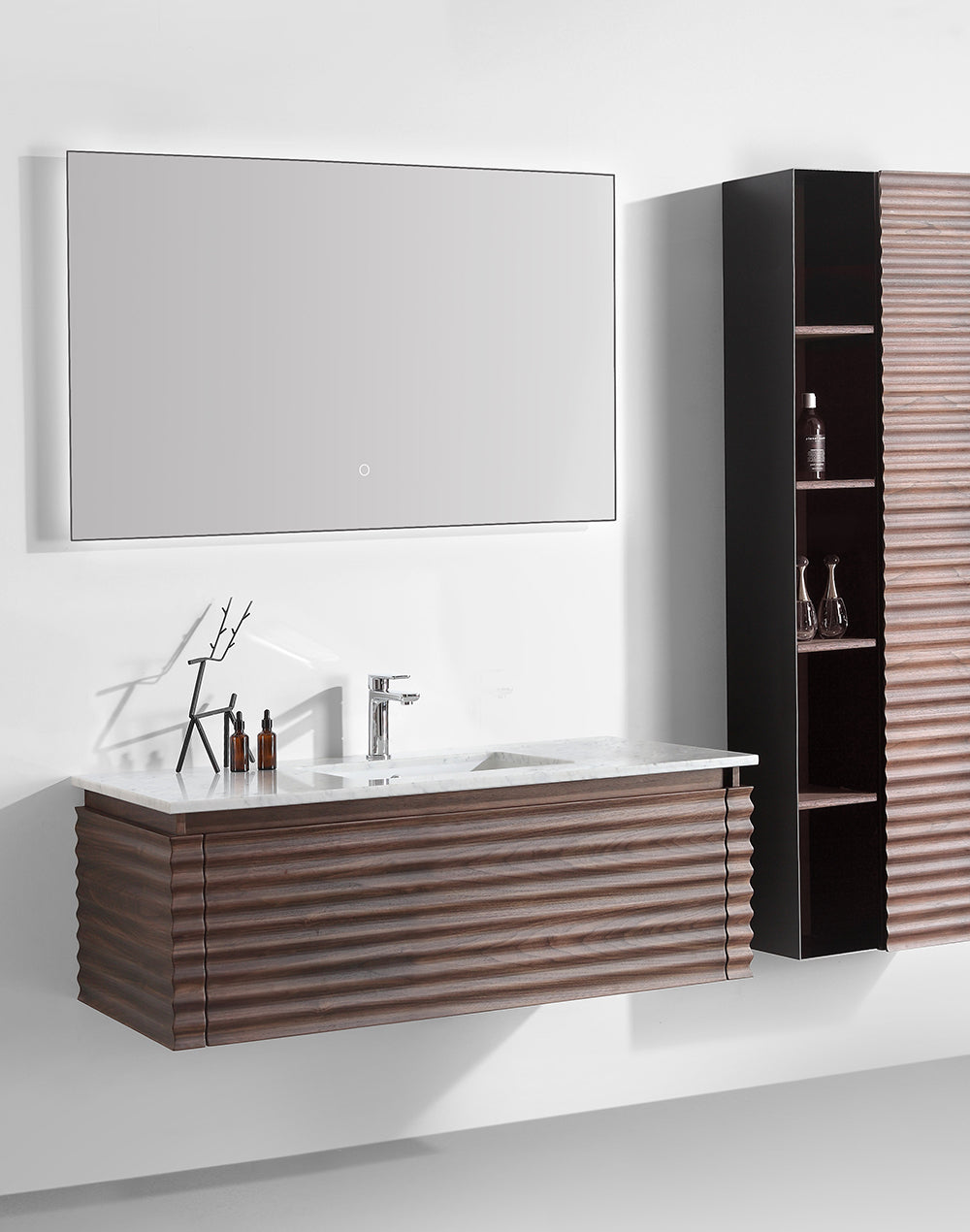 The cabinetry is complemented by the matching Loom mirror highlighted by the backlit LED lights and demister activated by the touch button.