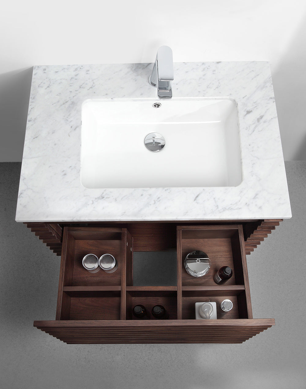 Available in 3 sizes, 800mm and 1200mm with a single ceramic bowl and single drawer, and 1400mm with twin ceramic bowls and double drawers, with the undercounter bowls enveloped by a natural marble bench top.