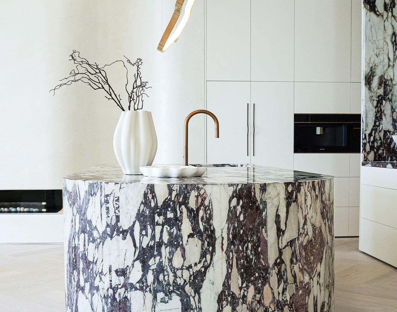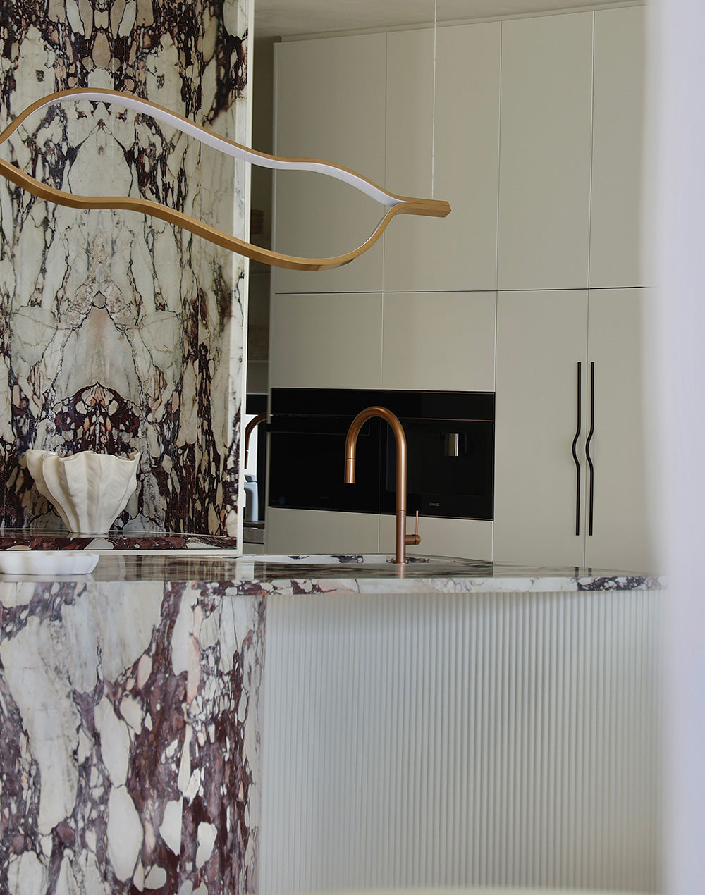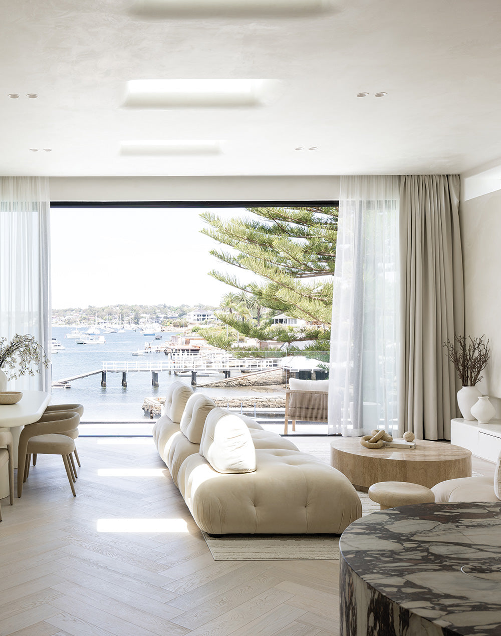 A vision of grand stone and marble accents with matt bronze features highlighting the unique stone colours and contrasting stunningly with lime stone walls, the Cronulla home presents like a waterfront apart from all others.