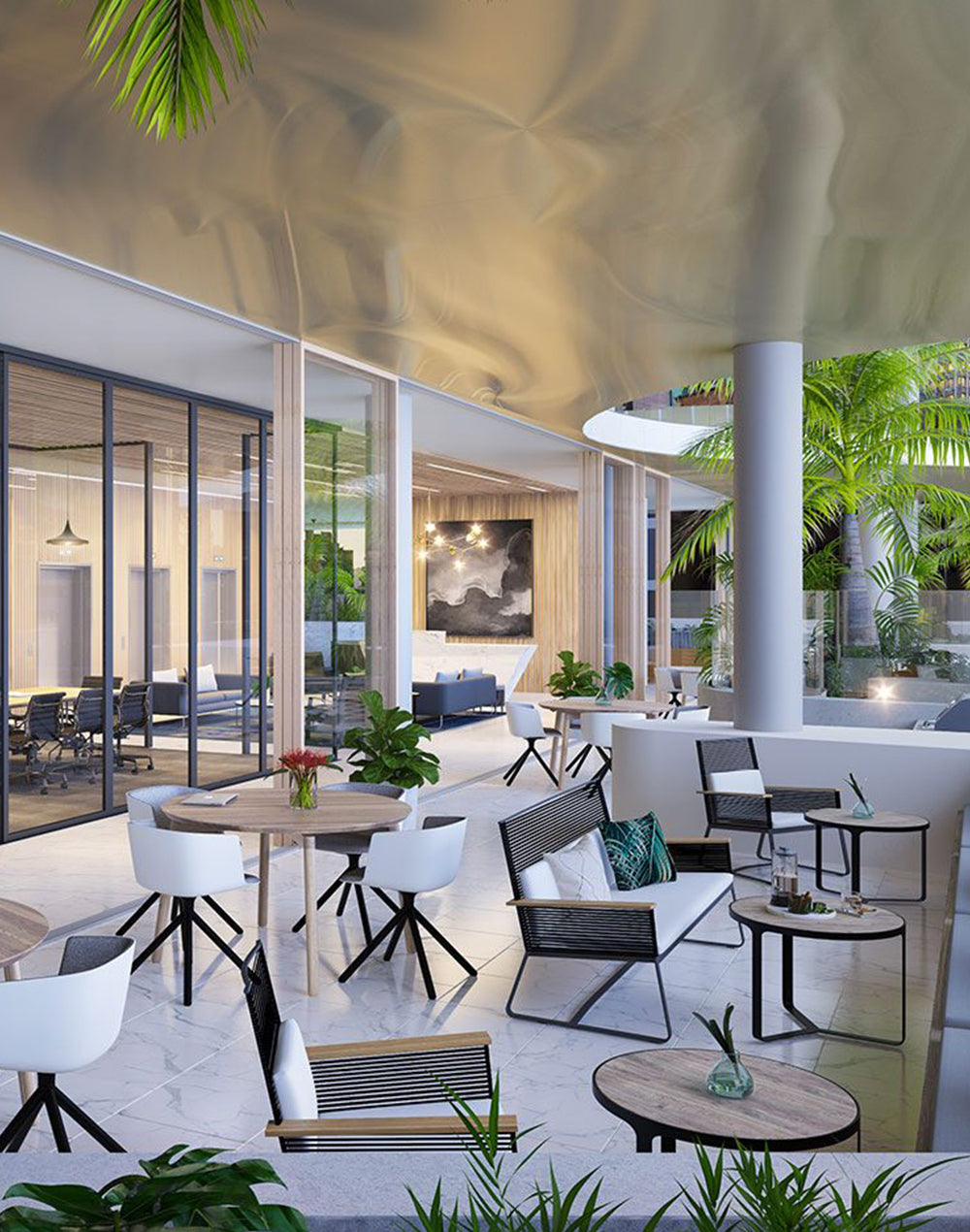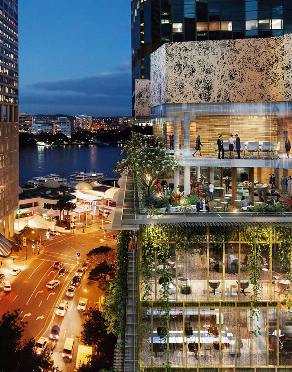Featuring a rooftop terrace with views to the Brisbane river and surrounding areas, the building offers a side core configuration to optimise natural light and views. Cascading gardens combine in a vertical village, providing access to fresh air and alfresco meeting spaces. The casual dining precinct features three new eateries and a vibrant forecourt offering indoor and outdoor seating.