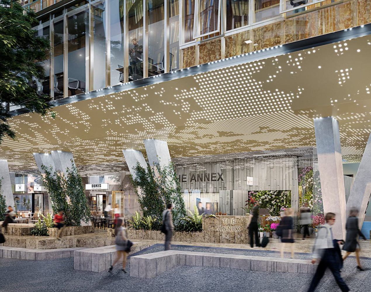 Rising from the street level plaza to an exclusive rooftop terrace, The Annex is an ambitious architectural statement with its scale, form and detail promoting a genuine connection to the outdoors and the adjacent Eagle Street fig trees.