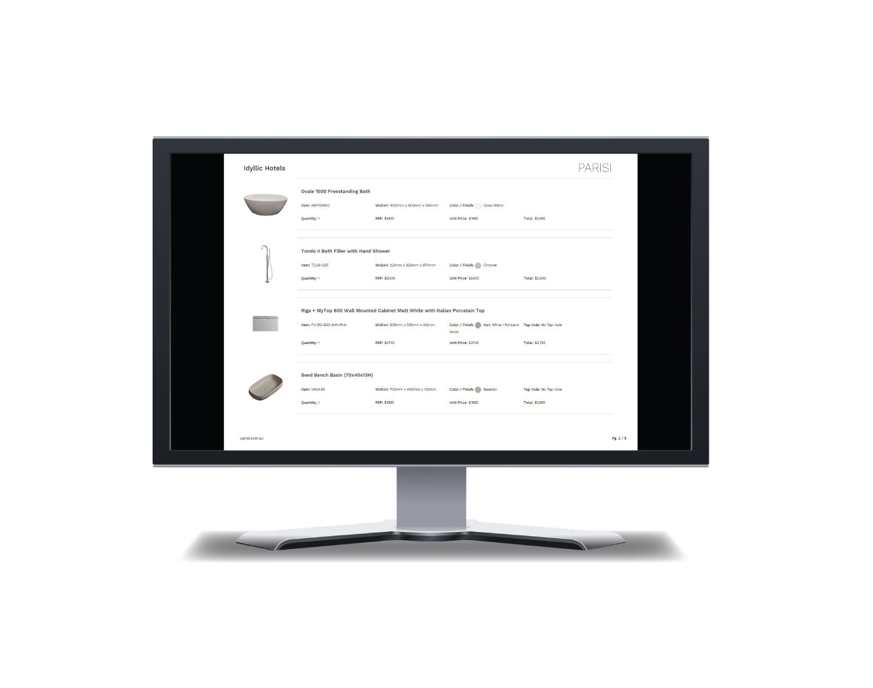 In PARISI Selection you can create and export full specifications, including specifications sheets. You can build your own collection of products, define quantities, change colours and tap hole options and move the products around to the order of your choice.